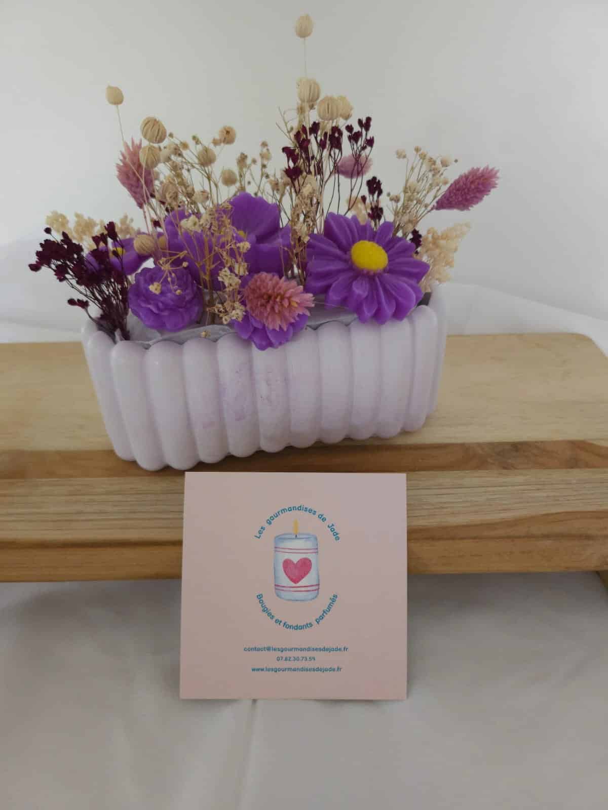 Bouquet de fondants parfumés Violette – Senteurs florales (conteneur jesmonite). Apportez une touche décorative et parfumée à votre intérieur avec ce bouquet de fondants parfumés senteur violette, aux notes florales douces et élégantes. Présenté dans un contenant en jesmonite fait main, il diffuse délicatement son parfum tout en décorant votre espace. Idéal comme objet parfumé artisanal ou idée cadeau originale.